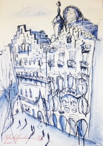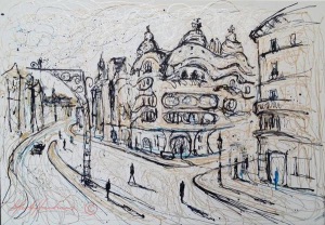 Paintings Spain Painting of Gaudi_s La Pedrera in blue